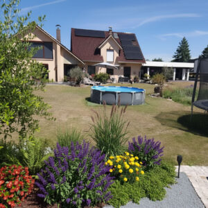 Der Garten und die Terrasse bieten viel Platz für Erholung, Spiel und Spaß. Hier fühlen sich nicht nur die Vögel wohl. Neben Schwalben, Enten und Fröschen besucht uns auch gerne der Grauhreiher und fischt im Teich nach kleinen Leckerbissen.