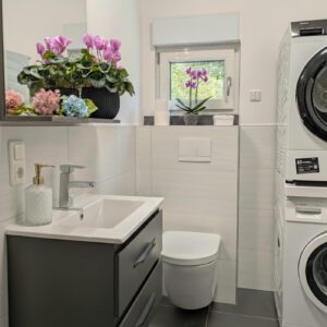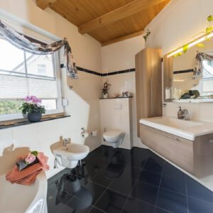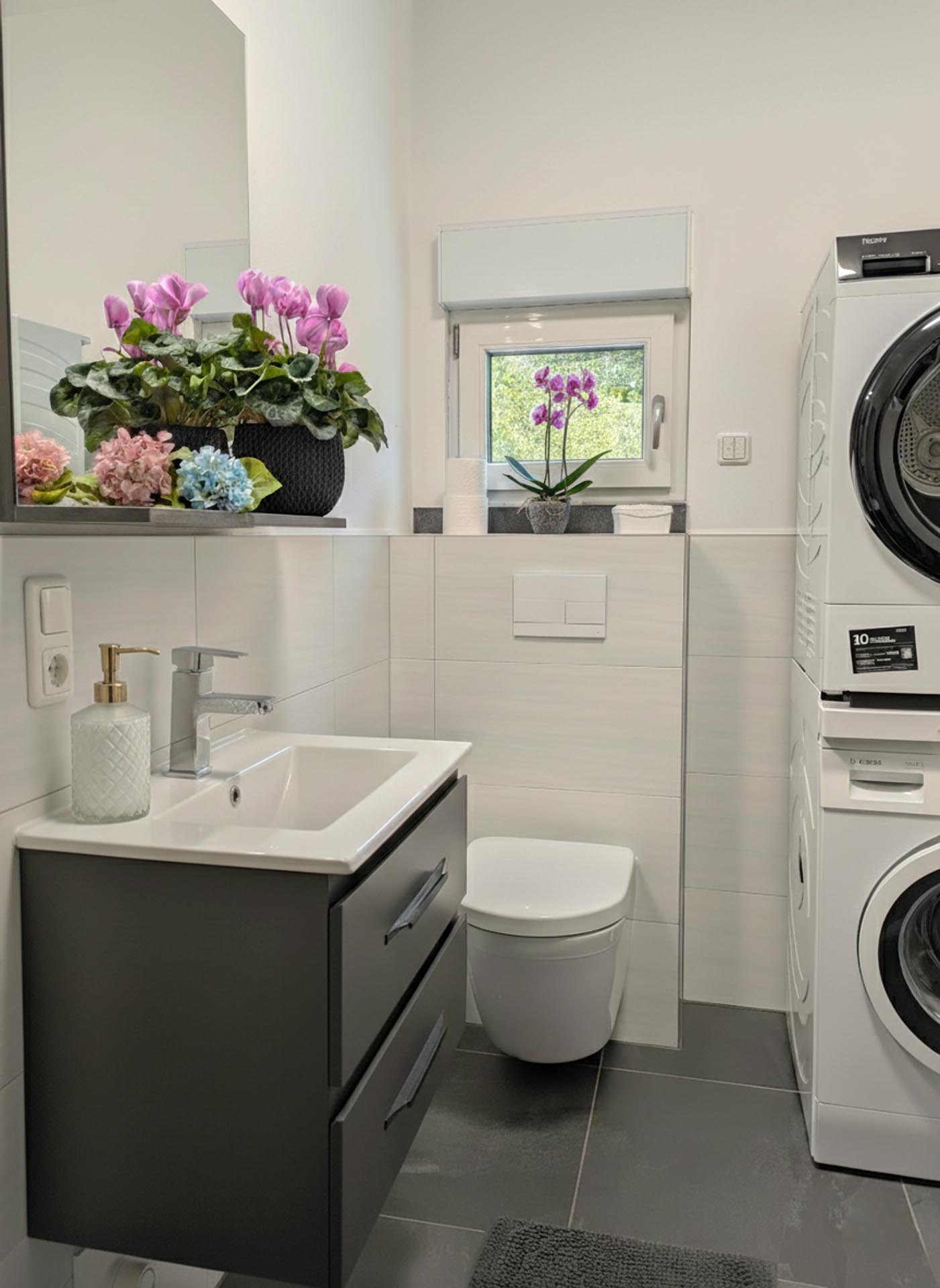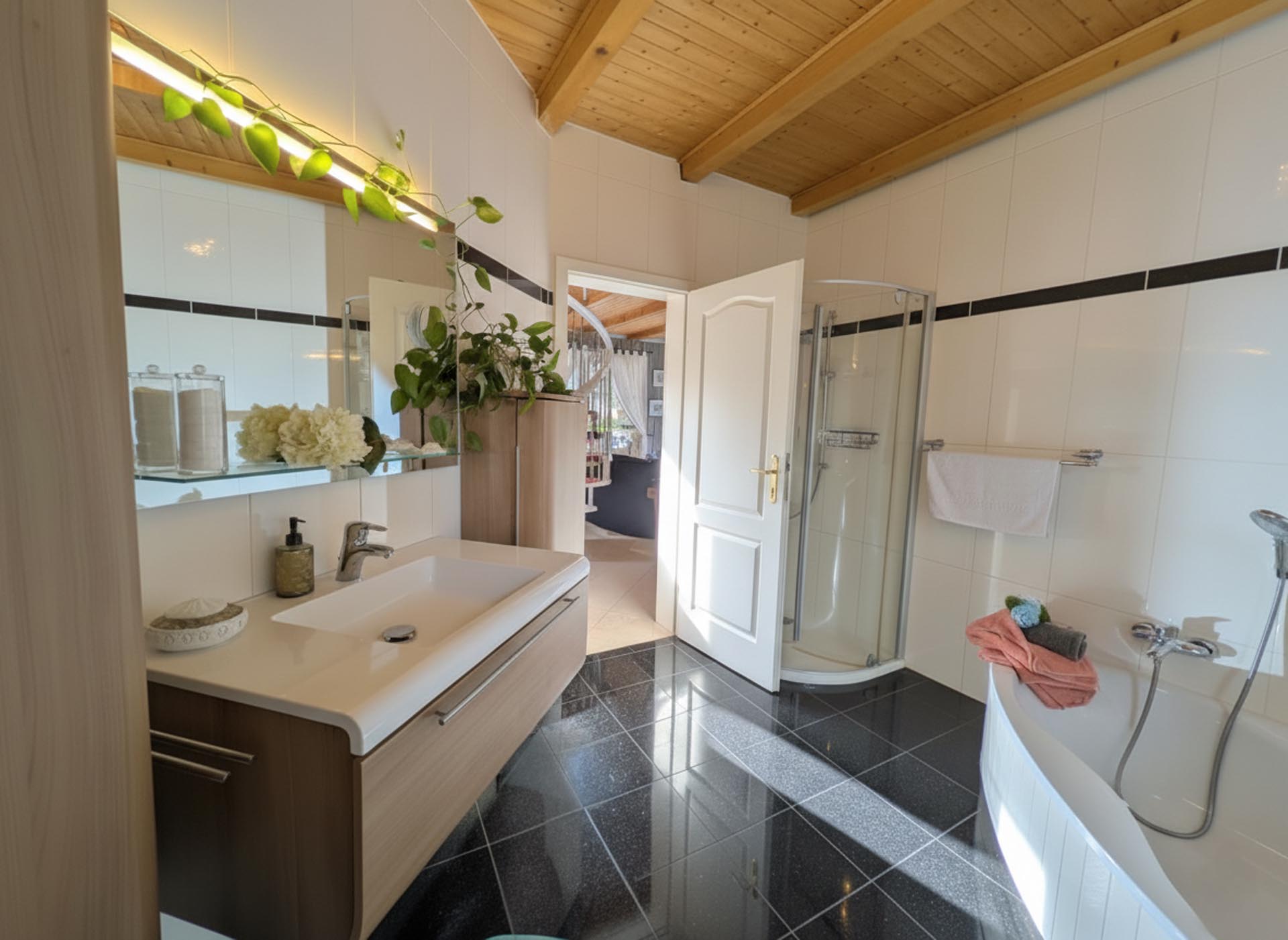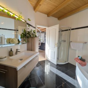 Unser Ferienhaus bietet ihnen ein luxuriöses Badezimmer mit bodentiefer Dusche und Badewanne, sowie ein kleines separates Bad mit Toilette und Waschbecken, sowie Waschmaschine und Wäschetrockner.