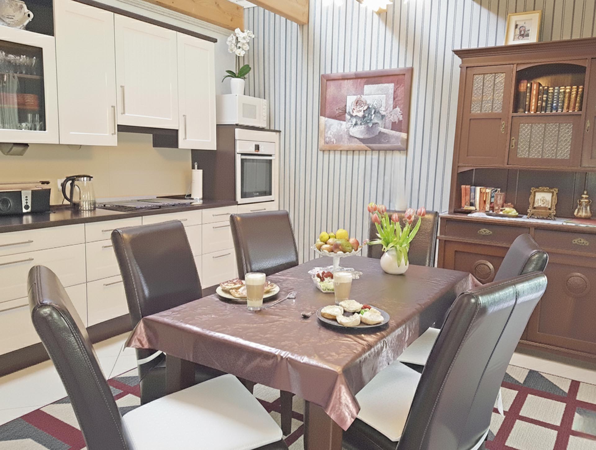 Die großzügige Einbauküche bietet moderne Ausstattung inklusive Herd, Backofen und Spülmaschine. Außerdem gibt es genügend Platz am großen Esstisch.