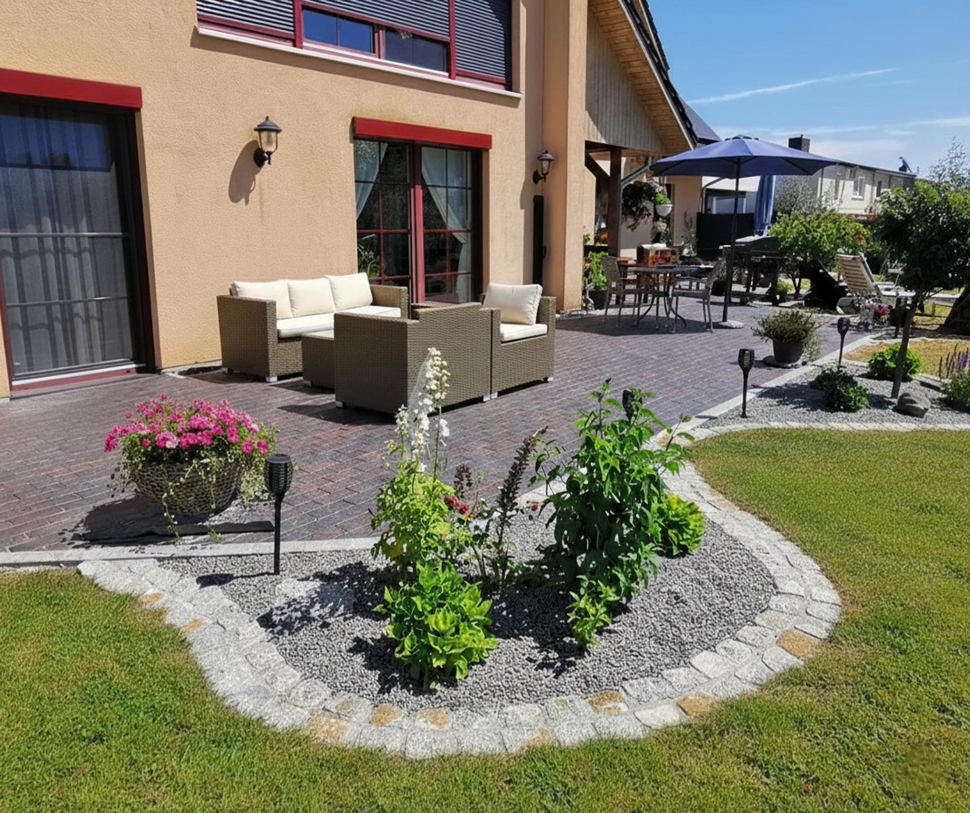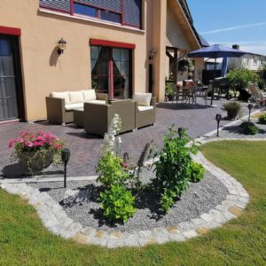 Das zum Haus gehörende Grundstück hat eine Fläche von 2000 qm, ist eingezäunt und steht Ihnen in vollem Umfang zur Verfügung. Die große Terrasse lädt zum Verweilen, Entspannen oder zu geselligen Grillabenden ein. Auf dem Grundstück, direkt vor Ihrem Hauseingang, sind zwei KFZ-Parkplätze für Sie reserviert. Mitgebrachte oder ausgeliehene Fahrräder sind überdacht und sicher untergebracht.